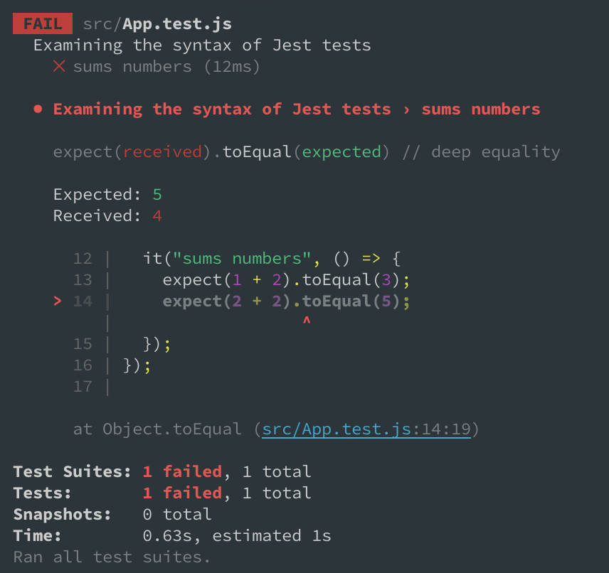 为了得到一个失败结果(希望不要有!),我们来改成 expect(2 + 2).toEqual(5):
